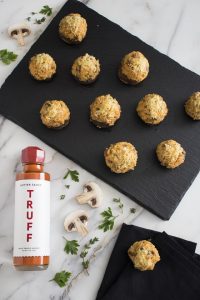 We cranked up the temperature on these stuffed mushroom appetisers! Baby portobello mushrooms are stuffed with a garlicky-cheesy filling heartily seasoned with our TRUFF White Hotter hot sauce. We love everything about this hotter, white truffle-infused, hot sauce…the aromatic properties of white truffles and the tongue-tingling heat of spicy peppers- just awesome! If you’re planning a party or are invited to a potluck, you must give this shroomy appetiser a try. Our twist on the classic with just a little extra punch.