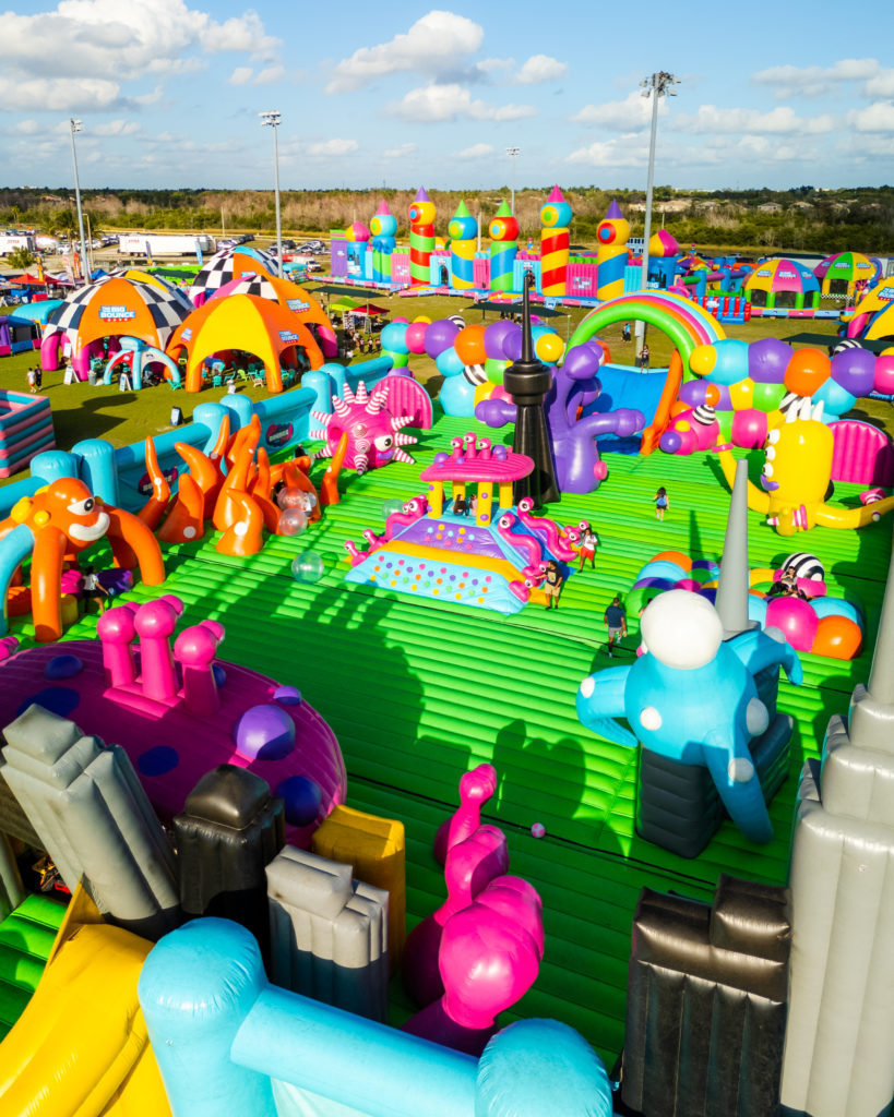 Covering more than 1,500 square metres, The Big Bounce Australia features a series of major attractions that combine physical activity with play. The centrepiece is the World’s Biggest Jumping Castle, an inflatable structure containing slides, climbing features, ball pits, basketball hoops and a central performance area with music and hosted activities. Alongside the castle sits a 300-metre obstacle course consisting of more than 50 challenges, a space-themed airSPACE zone with slides and elevated platforms, and a sports arena designed for team-based games and fast-paced movement.